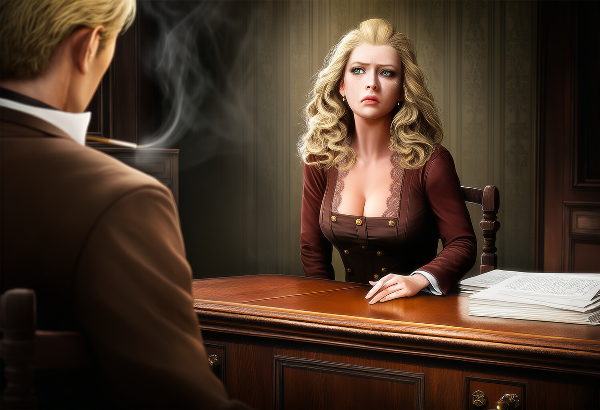 Back at my office, I found her waiting. The kind of woman who could make a priest reconsider his vows. She was all legs and curves, with blonde hair and green eyes that could melt steel. Despite her good looks she struck me as a dame who hadn't seen a lot, she had an innocence about her that I found captivating.